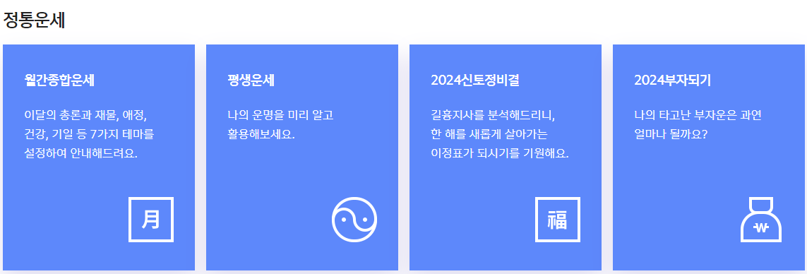 국내 최대 규모의 운세 사이트로, 사주, 궁합, 타로 등 다양한 콘텐츠를 제공합니다.